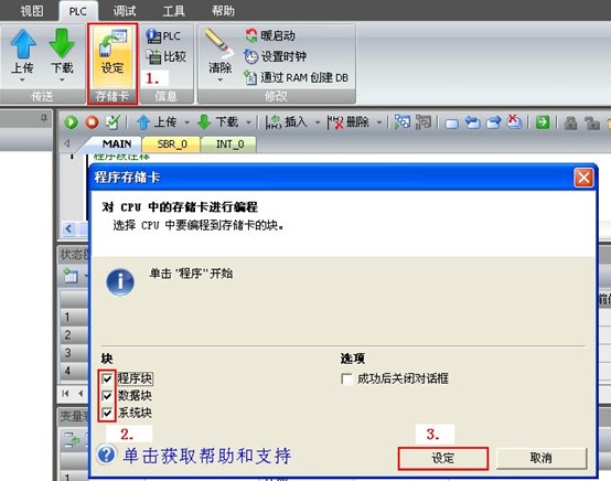 在 Micro/WIN SMART 中,點擊“PLC”->“存儲卡設定” ,打開“程序存儲卡”對話框,選擇需要被拷貝到存儲卡上的塊(程序塊、系統塊、數據塊),點擊“編程”設定,如圖2所示;