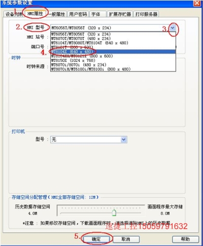 3、選擇“HMI 屬性”項(xiàng),在 HMI 型號中,點(diǎn)下拉箭頭選擇 MT8104X 相對應(yīng)的選項(xiàng)。